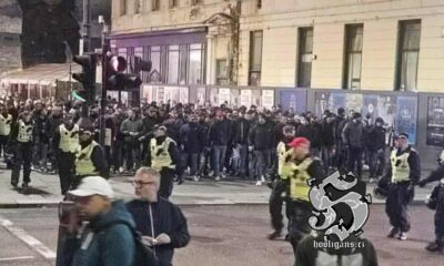 06.11.2025, Sparta Praha🇨🇿 – Raków Częstochowa🇵🇱, a large group of Raków hooligans near the Sparta stadium, click for more here: https://t.co/n1owx9EQrK