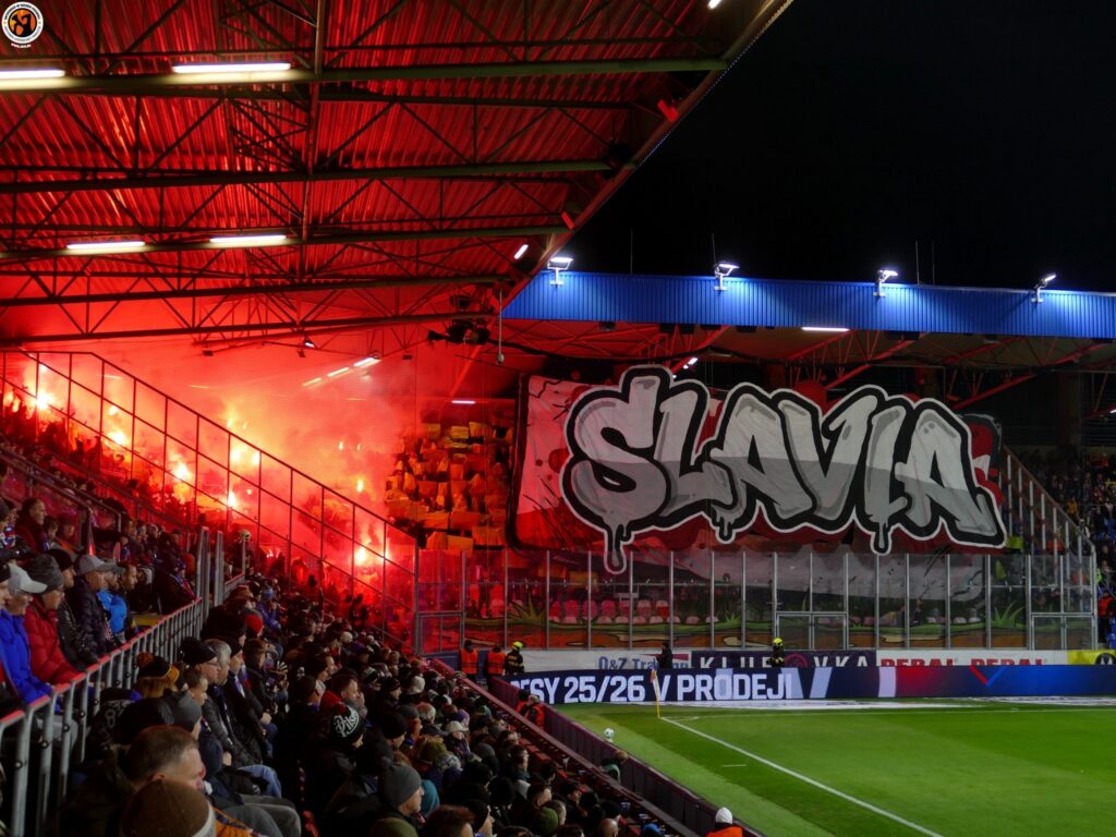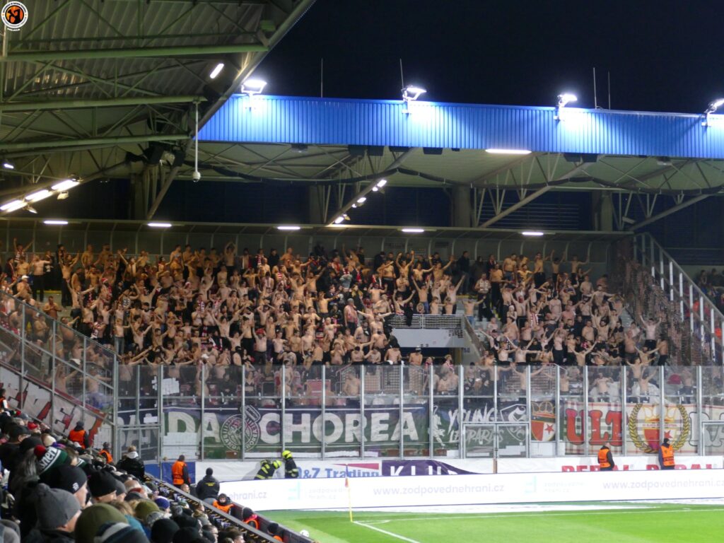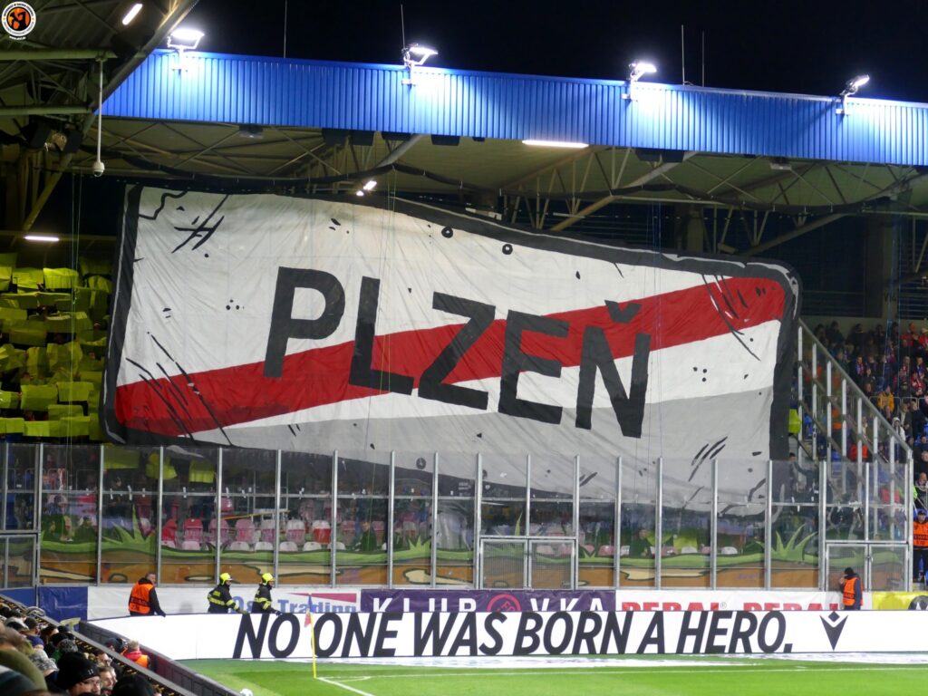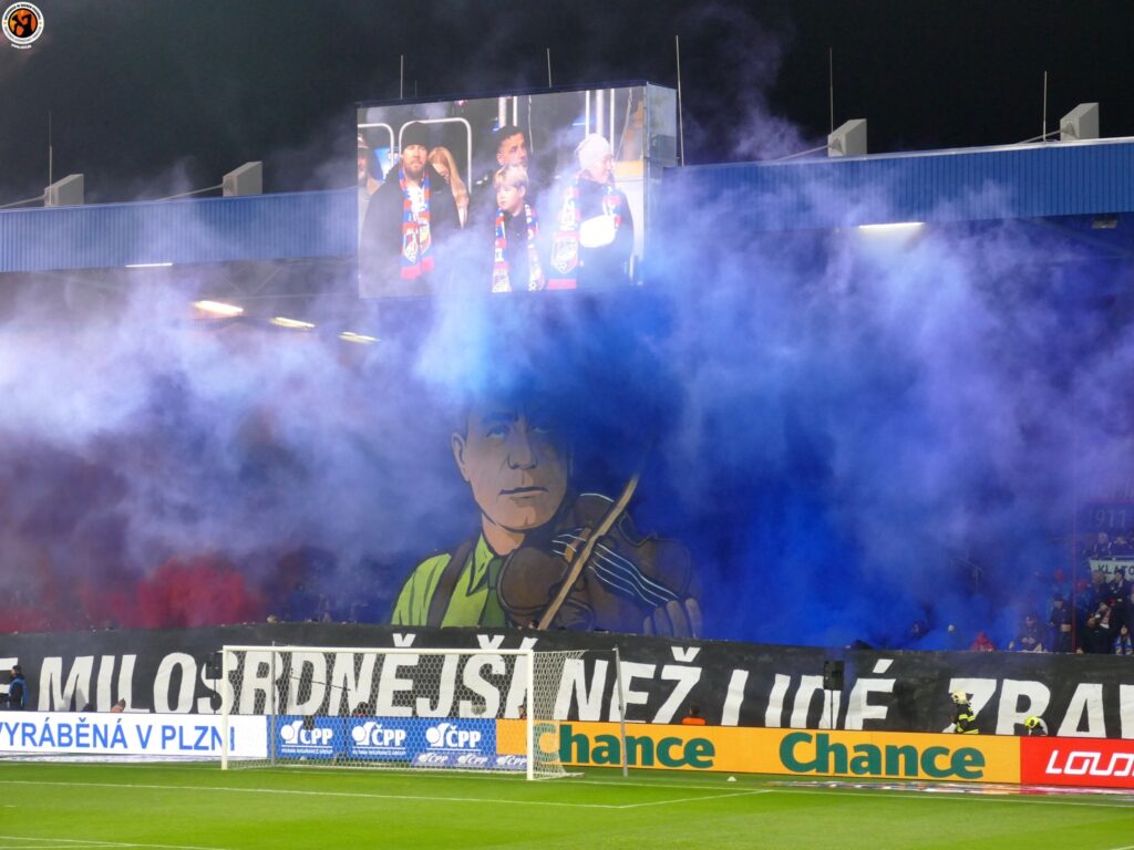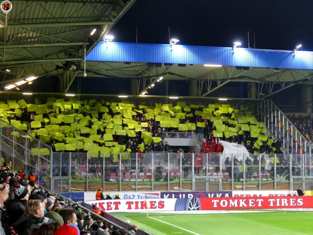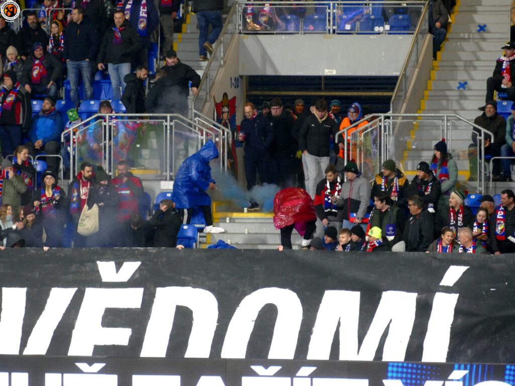 Slavia Praha with good numbers (600) in Plzeň. Match was interrupted in the first minutes due to pyrotechnics. After the interruption, Slavia Praha presented an interesting choreography