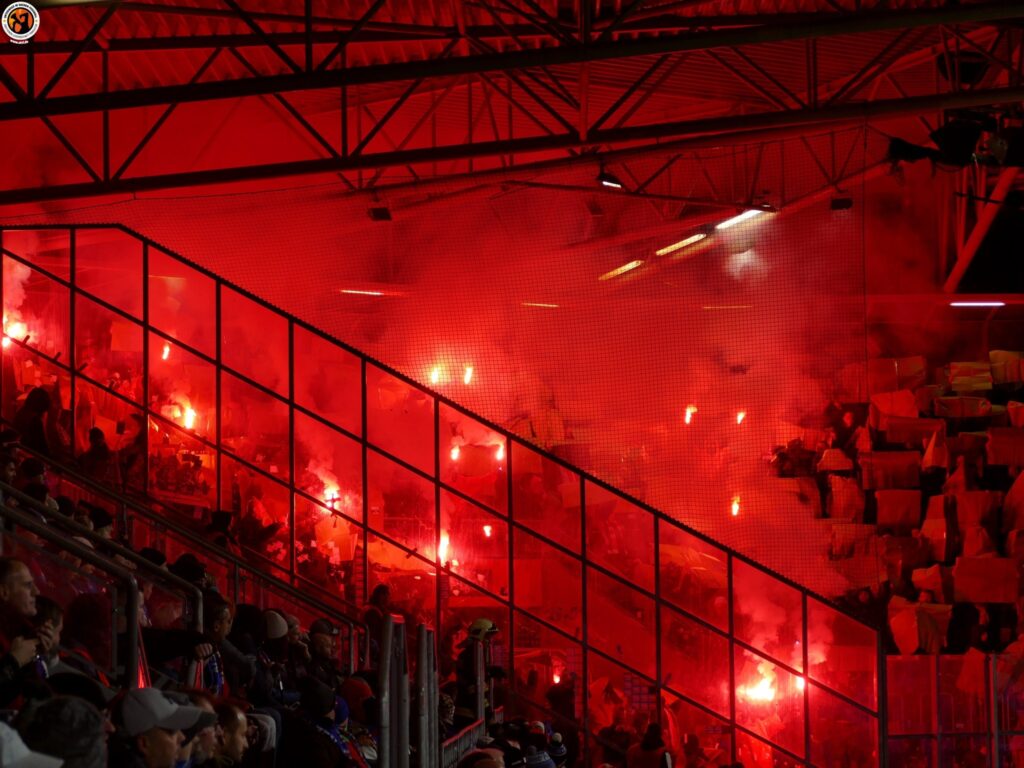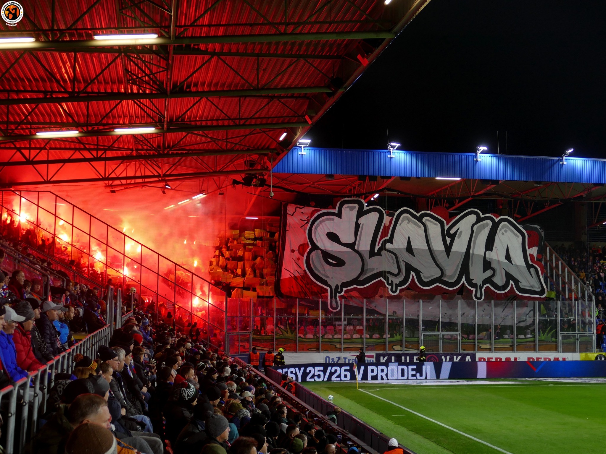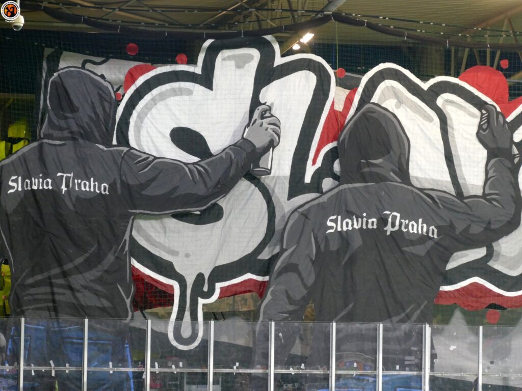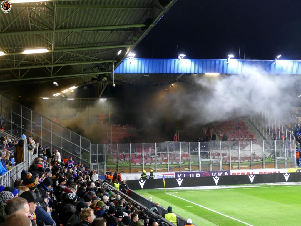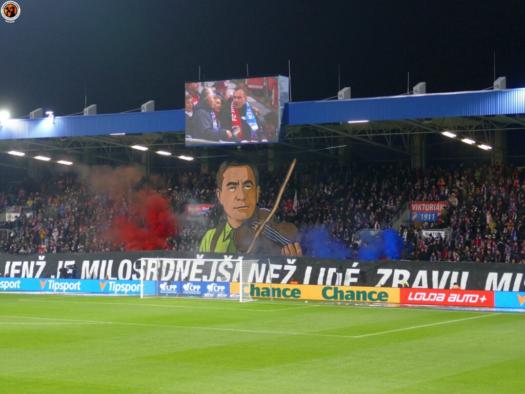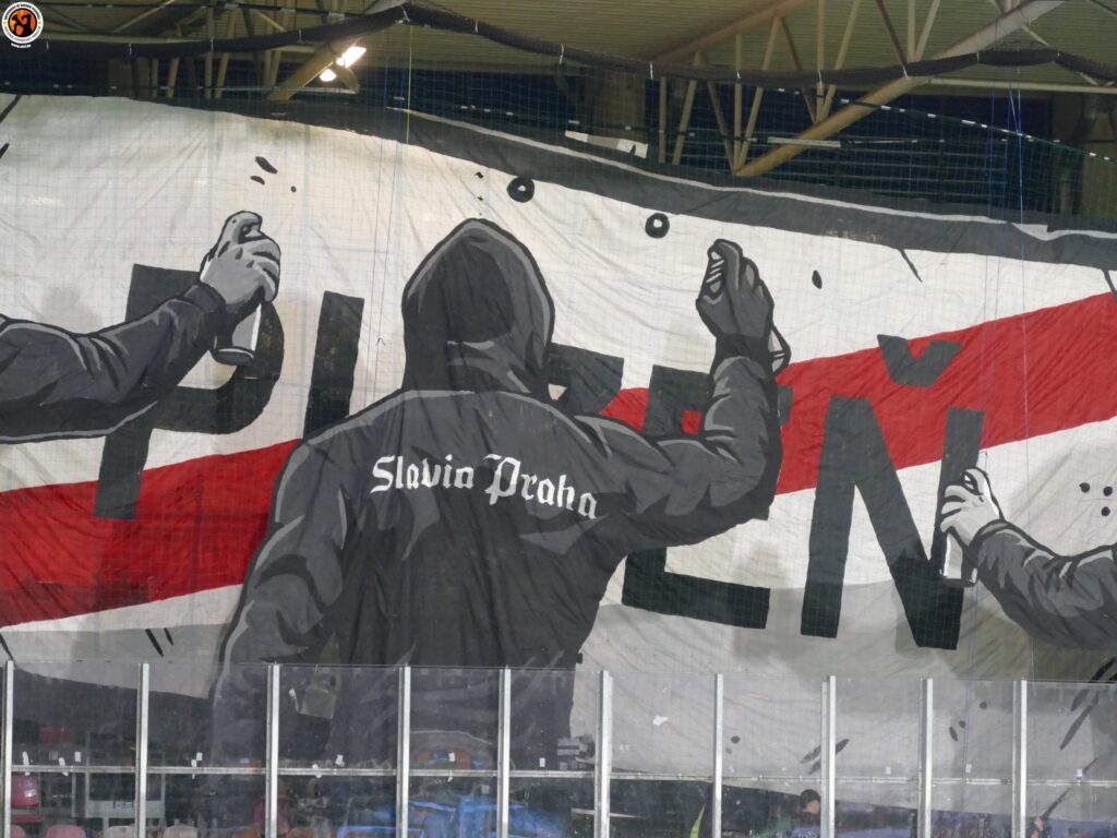 Slavia Praha with good numbers (600) in Plzeň. Match was interrupted in the first minutes due to pyrotechnics. After the interruption, Slavia Praha presented an interesting choreography
